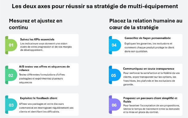 La réussite sur le long terme repose sur un pilotage continu : suivez vos KPIs (taux de multi-détention, ARPU, taux de couverture), testez vos approches et exploitez le feedback client. Et n’oubliez jamais que le multi-équipement reste avant tout une affaire humaine : conseil personnalisé, transparence totale et parcours client simplifié sont les clés de votre succès.